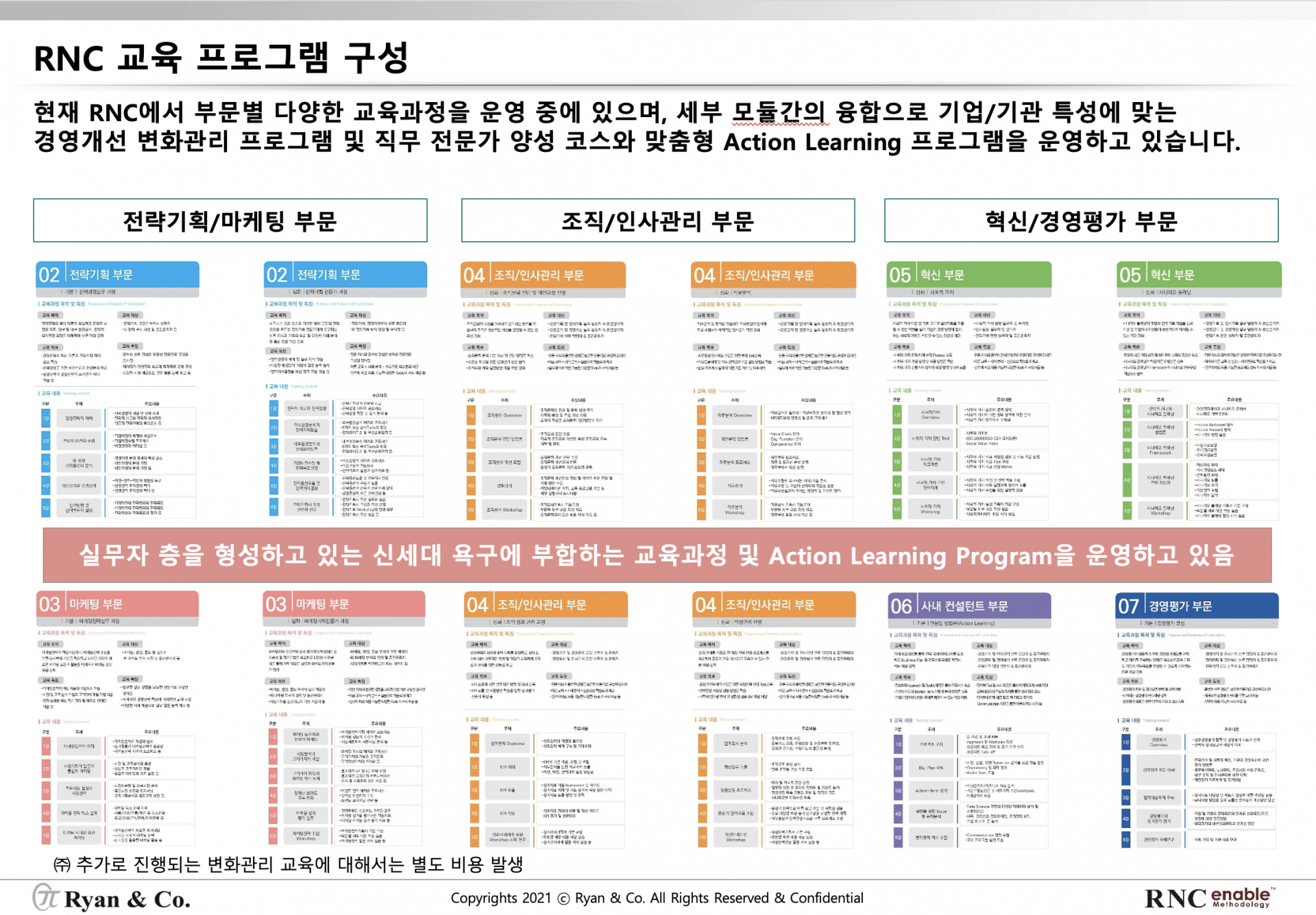 현재 RNC에서 부문별 다양한 교육과정을 운영 중에 있으며, 세부 모듈간의 융합으로 기업/기관 특성에 맞는 경영개선 변화관리 프로그램 및 직무 전문가 양성 코스와 맞춤형 Action Learning 프로그램을 운영하고 있습니다