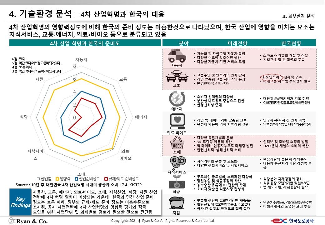 RNC는 한국도로공사 ‘4차 산업혁명에 따른 정부정책 대응 및 세부과제 마련‘, 도로교통연구원 ‘4차 산업혁명에 따른 고속도로 미래와 발전방안’과 한국도로공사 ‘ 드론 육성 산학연 협업모델 수립’ 및 국토교통부 ‘ICT 발달에 따른 교통물류산업 변화 예측’ 등 다양한 4차 산업혁명 관련 프로젝트를 성공적으로 수행하여 고객사로부터 높은 평가를 받았으며, 4차 산업혁명에 대한 연구역량을 지속적으로 축적하고 있습니다.